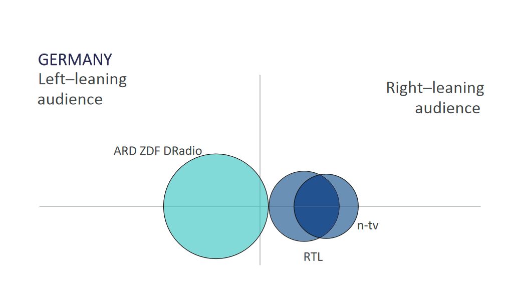 ARD und ZDF haben eine größere Reichweite (Publikumsanteil) als die „ausgewählten Privatsender“ n-tv und RTL. Die Zuschauer von ARD und ZDF ordnen sich selbst fast ausschließlich links der Mitte ein. Das bedeutet, dass die Sender ARD und ZDF das Publikum in der politischen Mitte kaum noch erreichen und die Menschen rechts der Mitte (fast) gar nicht mehr. Die Zuschauer von n-tv und RTL beschreiben sich selber ausschließlich „rechts“ der politischen Mitte auf der Skala.