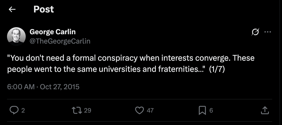 „You don’t need a formal conspiracy when interests converge. These people went to the same universities, they’re on the same boards of directors, they’re in the same country clubs, they have like interests, they don’t need to call a meeting, they know what’s good for them, and they’re getting it.
