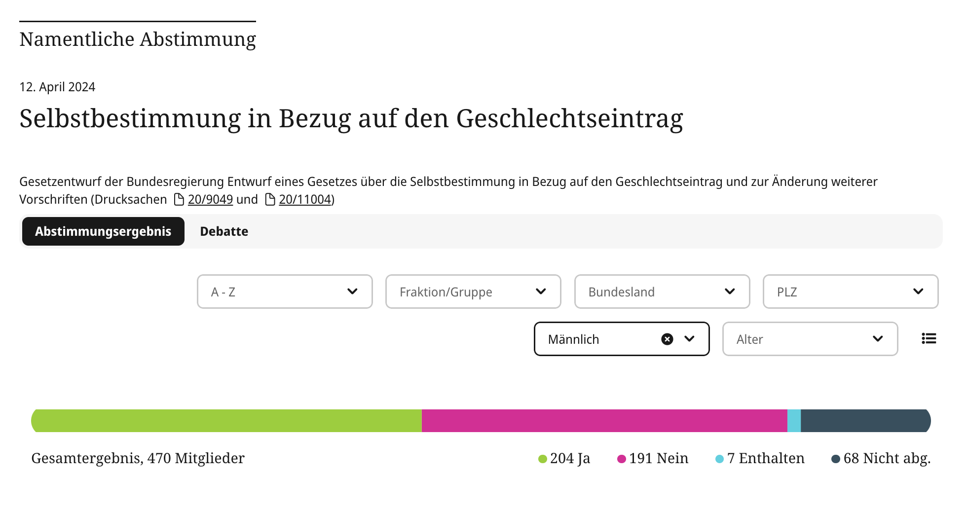Von 470 männlichen Mitgliedern des Bundestages stimmten 204 mit JA und 191 mit NEIN ab. Der Einfachheit halber nehmen wir hier eine Ratio von eins zu eins an.