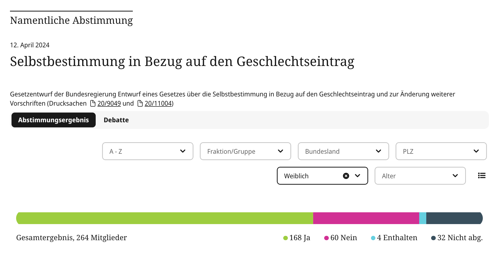 Von 264 weiblichen Mitgliedern des Bundestages stimmten 168 mit JA und 60 NEIN ab. Der Einfachheit halber nehmen wir hier eine Ratio von eins zu drei an (gerundet: 180 zu 60).
