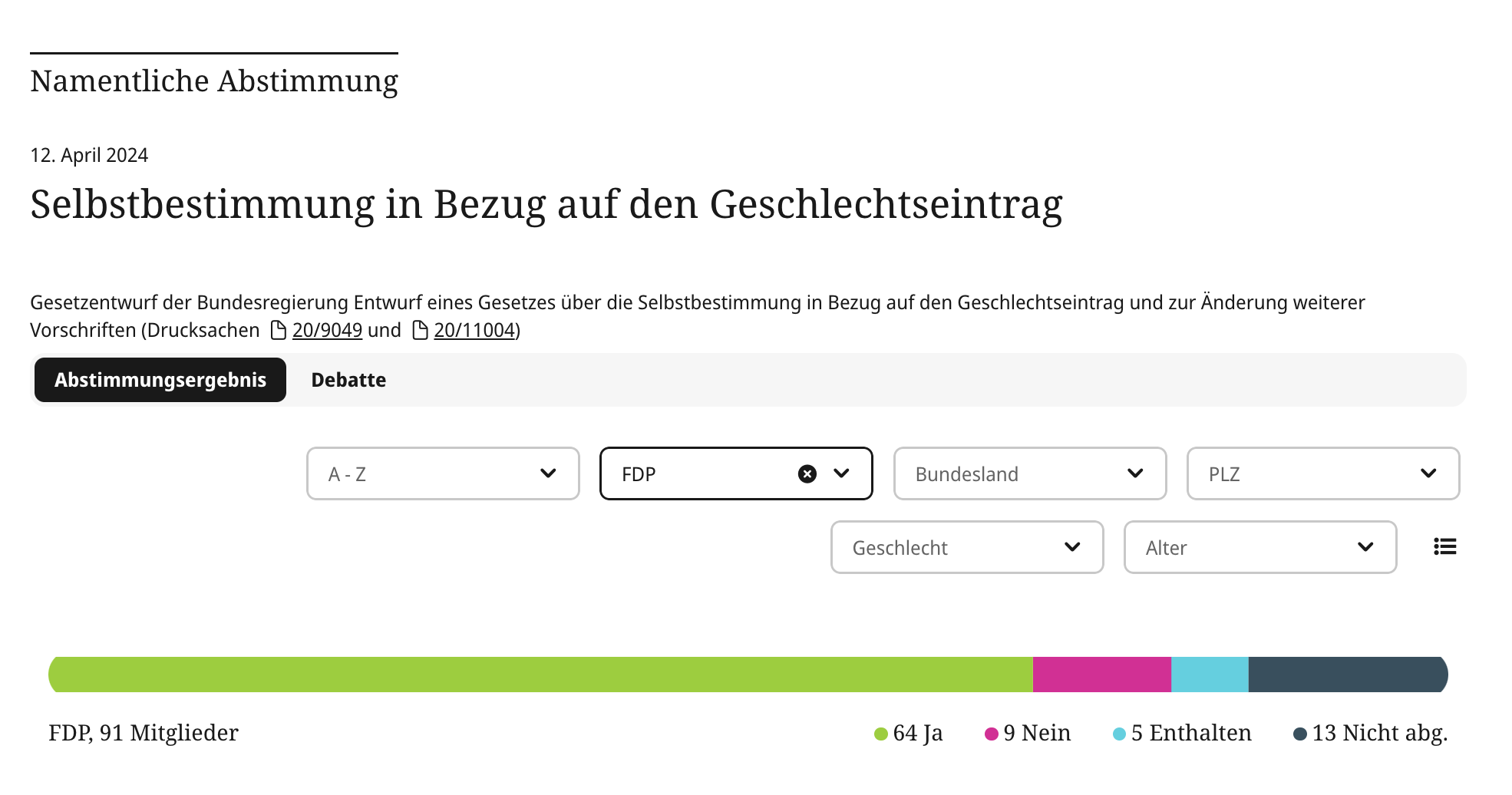 Wenn bei einer Umfrage im Jahr 2022 die Hälfte der FDP Wähler gegen das Selbstbestimmungsgesetz gewesen ist, aber die Mehrheit der Bundestagsabgeordneten der FDP 2024 dem Gesetz zugestimmt hat, dann hat die FDP Bundestagsfraktion Quantitativ zu der Position der Grünen Wähler (71 % Zustimmung) aufgeschlossen.